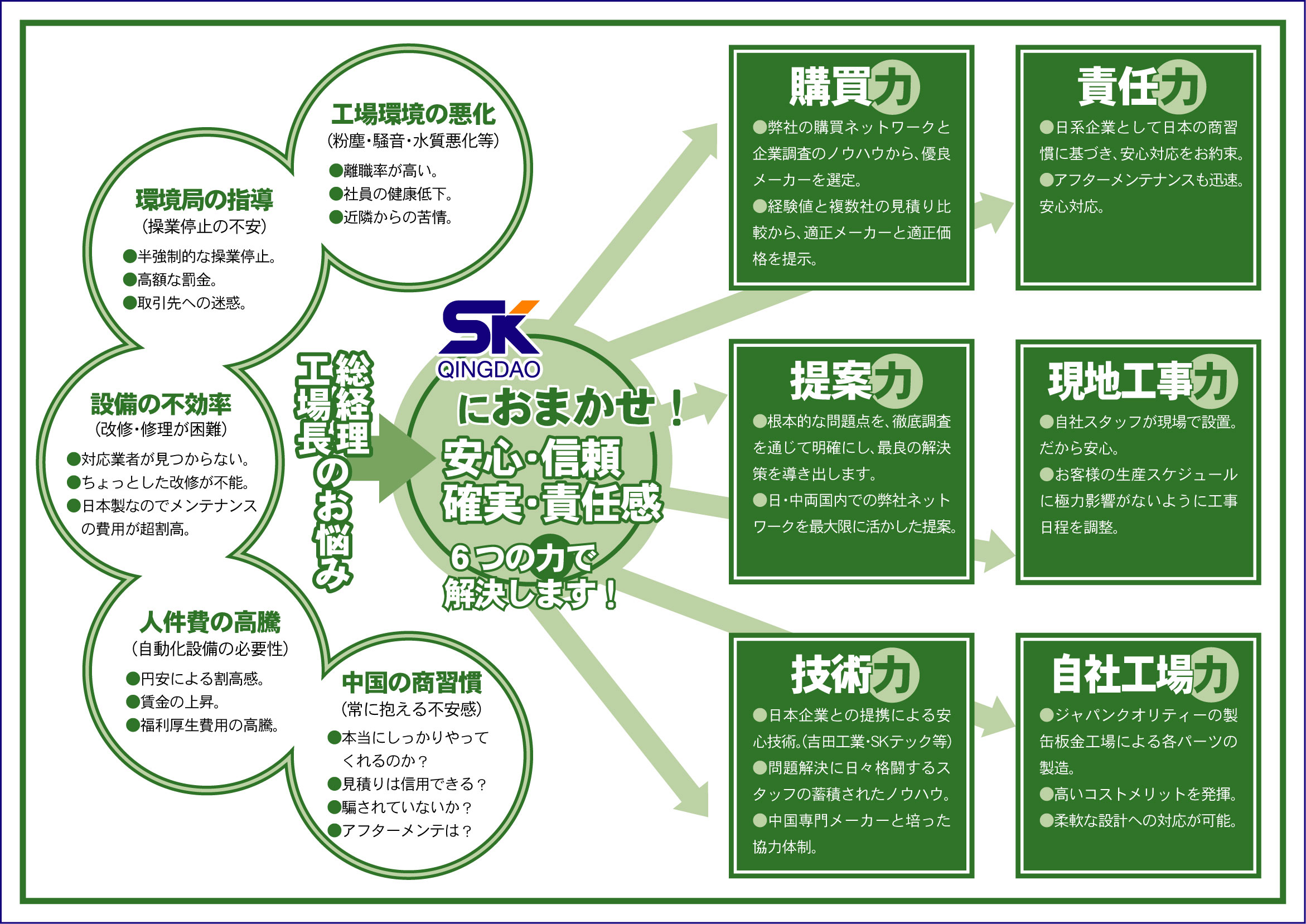 環境問題が深刻化する中国において、環境局からの指導により厳しい改 善が求められるようになってきました。と言われても、どのように対策をした らいいのか困ってしまいますよね。そんな時、わが社へお電話ください。 日系企業ならではの安心・信頼・確実・責任感で解決します!!
